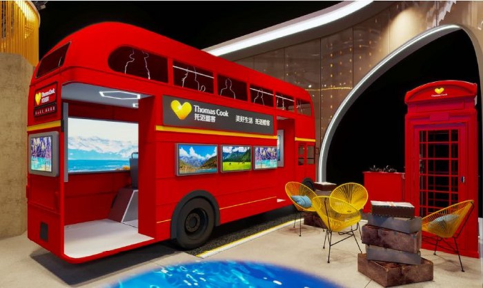 今年复星旅文也带着旗下收购的欧洲古老品牌托迈酷克(Thomas Cook)首次公开亮相进博会,用户可在展区内的“伦敦街头”红色双层巴士打卡英国名胜,还可在红色电话亭内给未来的自己制作有声明信片。